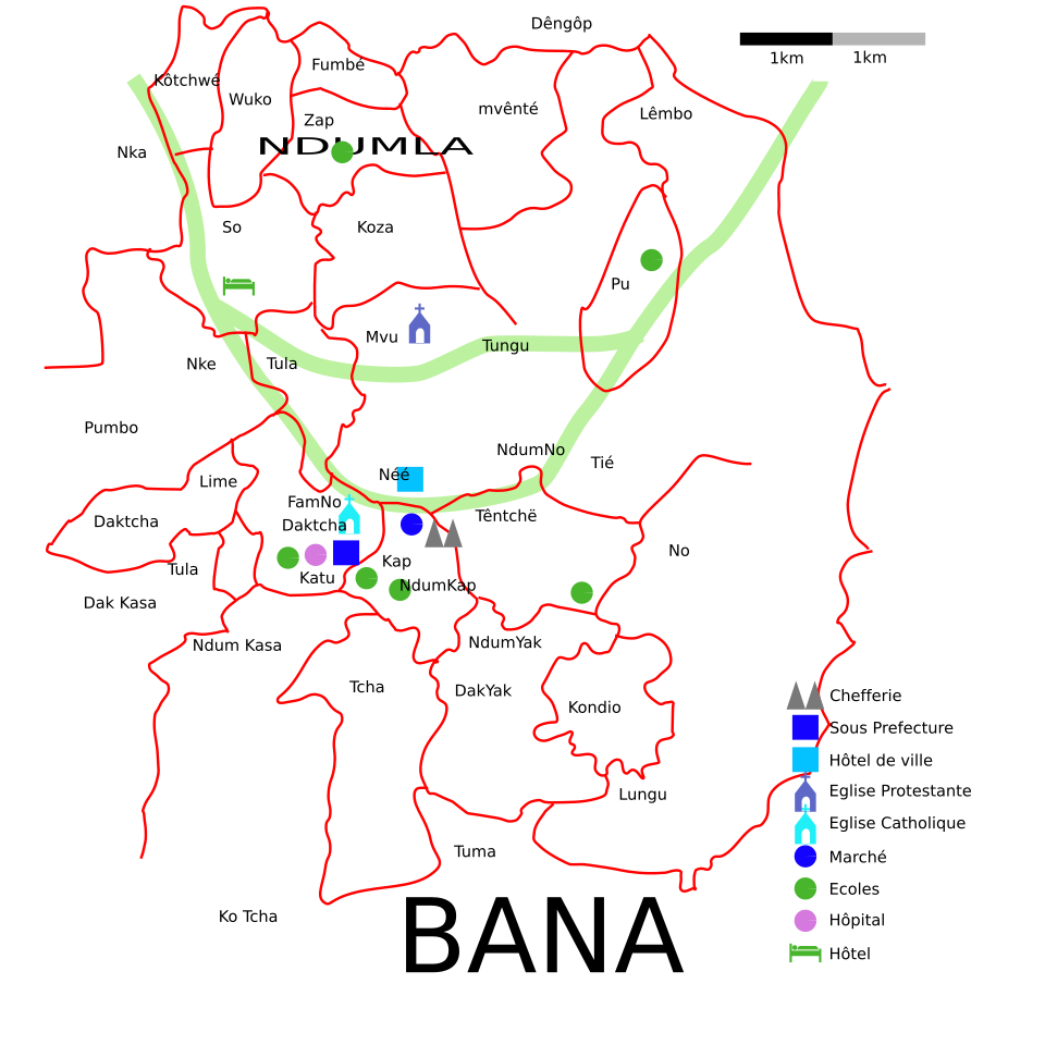 La commune de Bana est située dans la région de l’Ouest du Cameroun, plus précisément dans le département des Hauts-Plateaux. Elle est habitée majoritairement par le peuple Bamoun, riche d’une histoire et de traditions bien ancrées. Bana se distingue par son relief de hauts plateaux, son climat relativement frais et sa végétation favorable à l’agriculture. Le chef-lieu communal, également appelé Bana, joue un rôle administratif et social central pour les villages environnants.